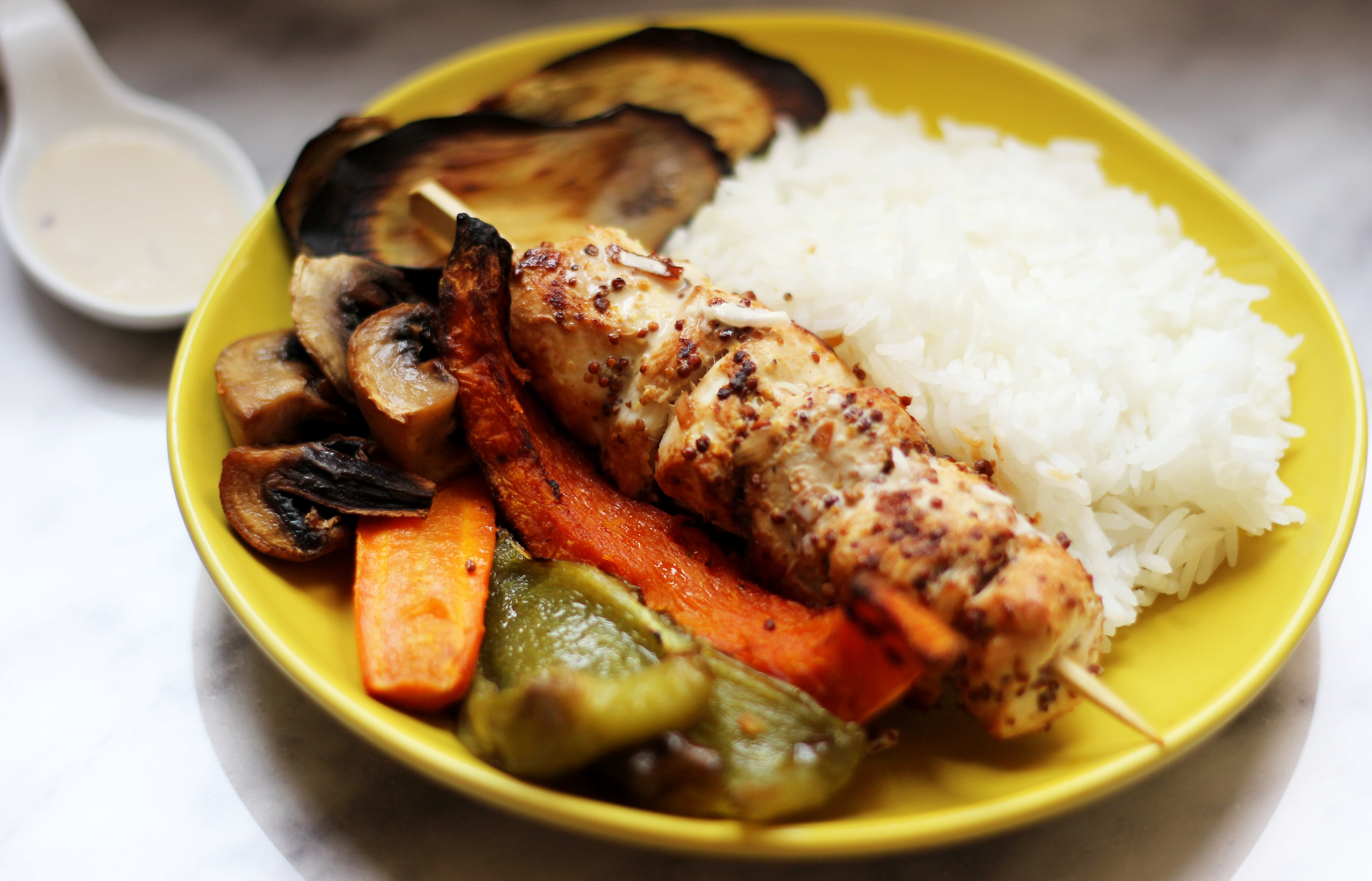| 2. | Dans un bol, ajouter les morceaux de poulet puis la moutarde à l'ancienne ainsi qu'une échalote et une gousse d'ail émincées. |